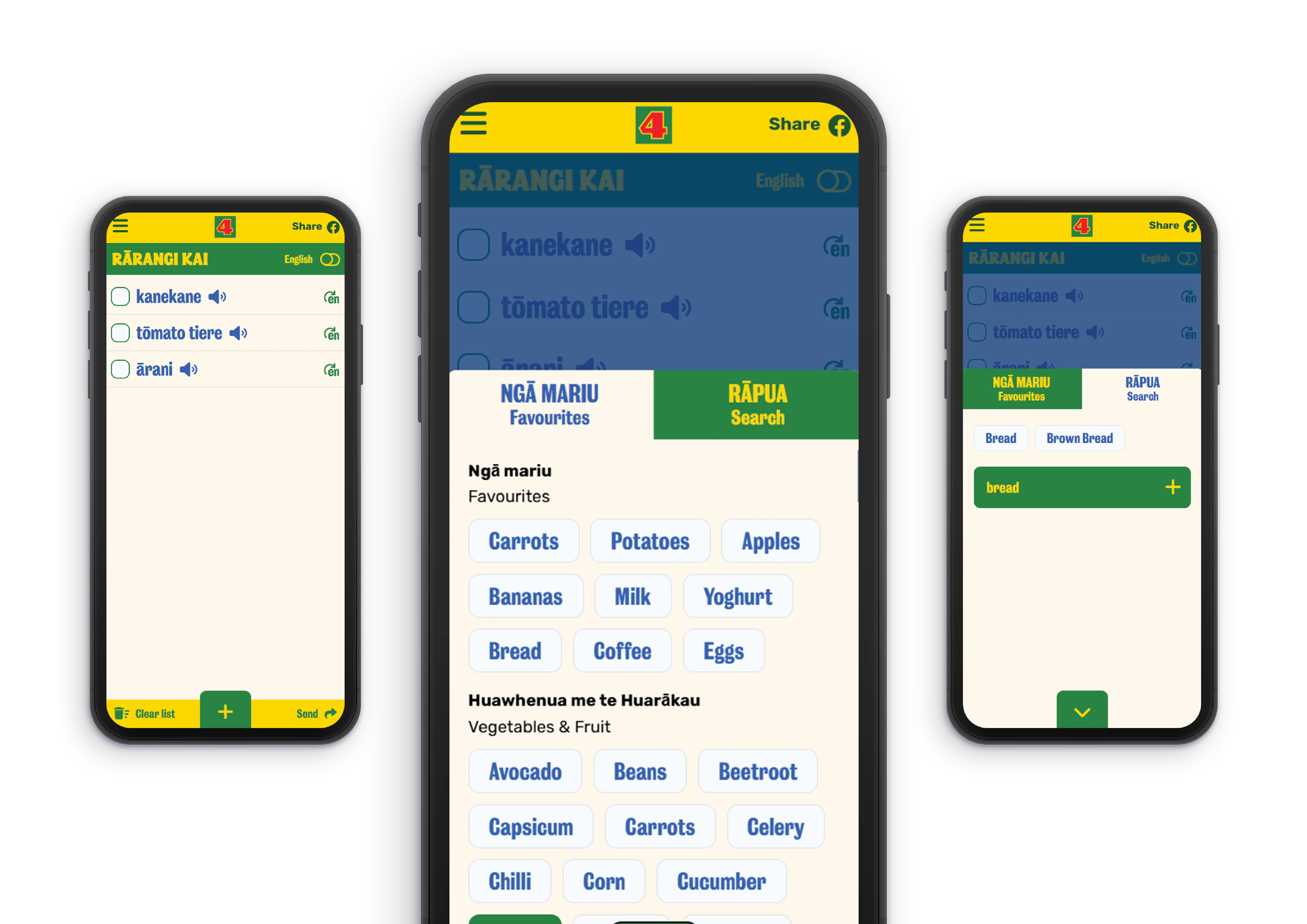 My Work Four Square / FCB New Zealand Rārangi Kai The fun way to learn te reo Māori Rārangi Kai lets you build your shopping list and see every item translated into te reo Māori Full-stack development, UI/UX design Shopping, Translation rarangikai.foursquare.co.nz Additional